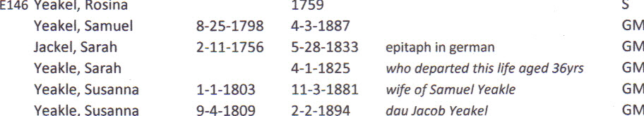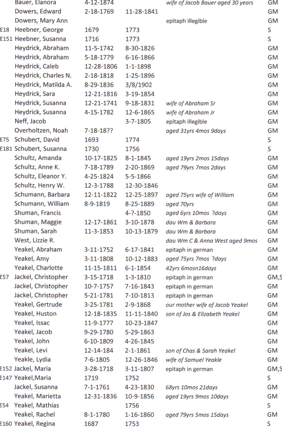 The Yeakel Cemetery began as a private burial ground over 260 years ago. There is no single source of records one could refer to. However, through careful research a list of burials has been created. The main sources of information are The Genealogical Record of the Schwenkfelder Families and tombstone transcriptions. The number to the left of some of the names indicate immigrants. The numbers are identifiers created by the Schwenkfelders to help genealogists keep track of family groups. The letters on the far right indicate whether a grave marker is present (GM) and if the individual is listed on the Schwnkfelder monument (S).